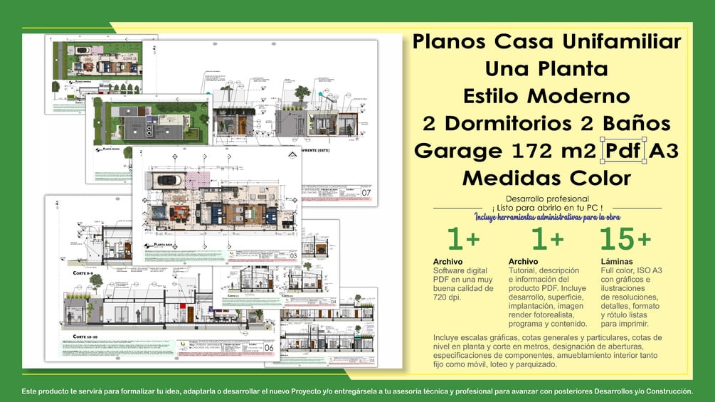 Planarq Freelancer Planos Casa Unifamiliar de Una Planta Estilo Moderno 2 Dormitorios 2 Baños Garage 172 m2 Pdf A3 Medidas Color